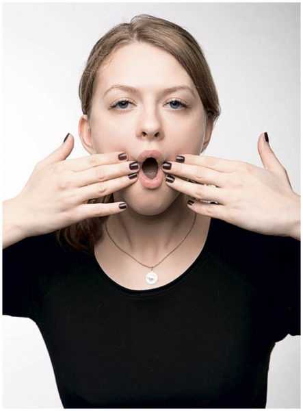 Руки сложены на ключицах, челюсть поднята вверх, губы сжаты. Из этого положения резко “чмокните”, но должен получиться не “воздушный поцелуй”, а, скорее, жест в итальянском стиле, означающий что вам очень вкусно, но губы при этом должны оставаться напряженными и твердыми, рот раскрыть широко, надувать губы не надо. Чем громче вы “чмокнете”, тем больше задействованы нужный мышцы. — Всего 2 подхода по 12 повторений. Между подходами небольшая пауза.