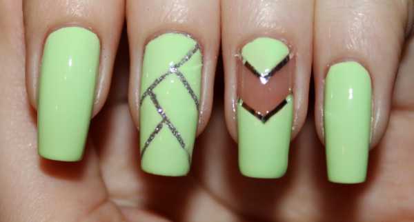 Дизайн можно выполнить при помощи скотча (нужно помнить, что прежде чем наклеить скотч на ногтевую пластину, слои лака должны просохнуть) или тонких кистей. При помощи кисти контур получается более четким и ровным. В данном дизайне не ограничивайте себя в цвете. Подбирайте различные сочетания лака.