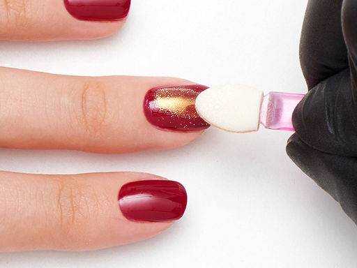 - Берем губку (лучше отрезать от губки небольшой кусочек, чтобы она была не шире ногтевой пластины), пропитываем ее выбранными лаками и быстрыми, легкими приминающими движениями, наносим цвет от зоны кутикулы до свободного края.