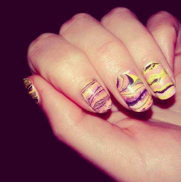 Наполните емкость водой. Капните туда немного лака и дайте ему растечься. Добавьте другие цвета, попытайтесь создать какой-нибудь узор.
