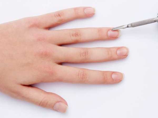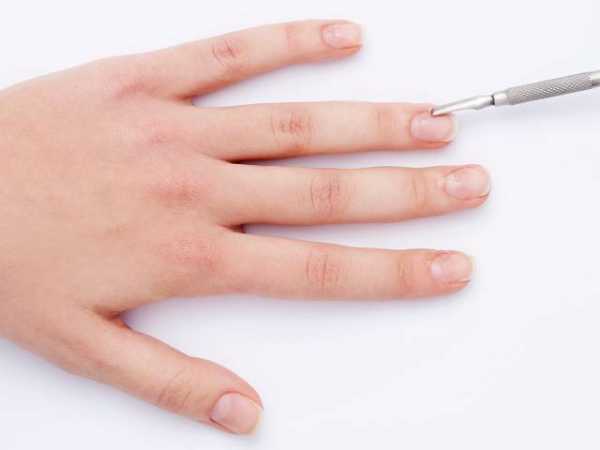Апельсиновой палочкой или специальным пушером аккуратно отодвиньте кутикулу и птеригий – нижний слой кутикулы, который представляет собой тонкую пленку.