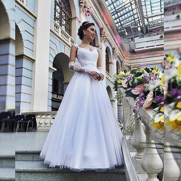 Невеста выбрала классическое белое платье с пышной юбкой и кружевным верхом с прозрачной спиной. Аккуратная причёска и локоны были украшены длинной фатой. Жених красовался в классическом костюме-тройке.