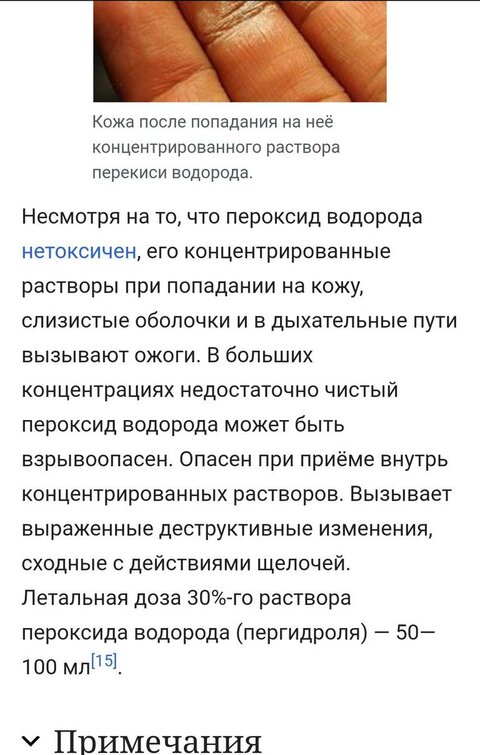 - «Пищевая» перекись водорода 35%. Несмотря на название, перекись водорода пищевого качества никогда не следует принимать внутрь — она может вызвать серьезные внутренние ожоги при проглатывании.