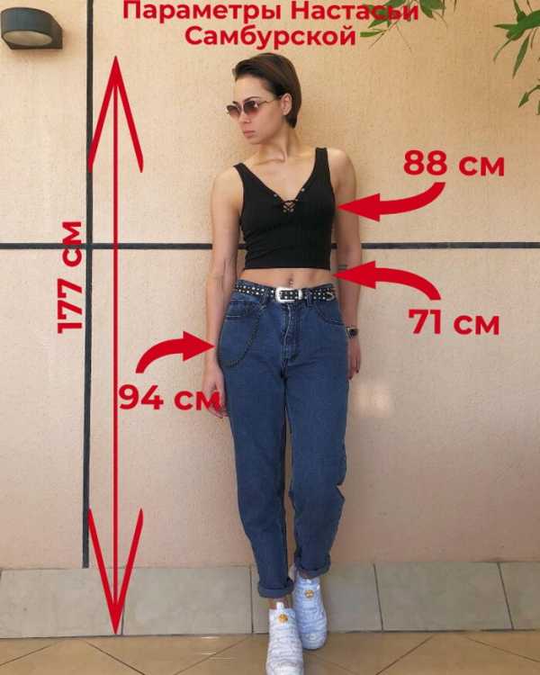 Рост Настасьи Самбурской равен 177 сантиметрам. Параметры фигуры следующие: объем груди – 88 см, объем талии – 71 см, объем бедер – 94 см.