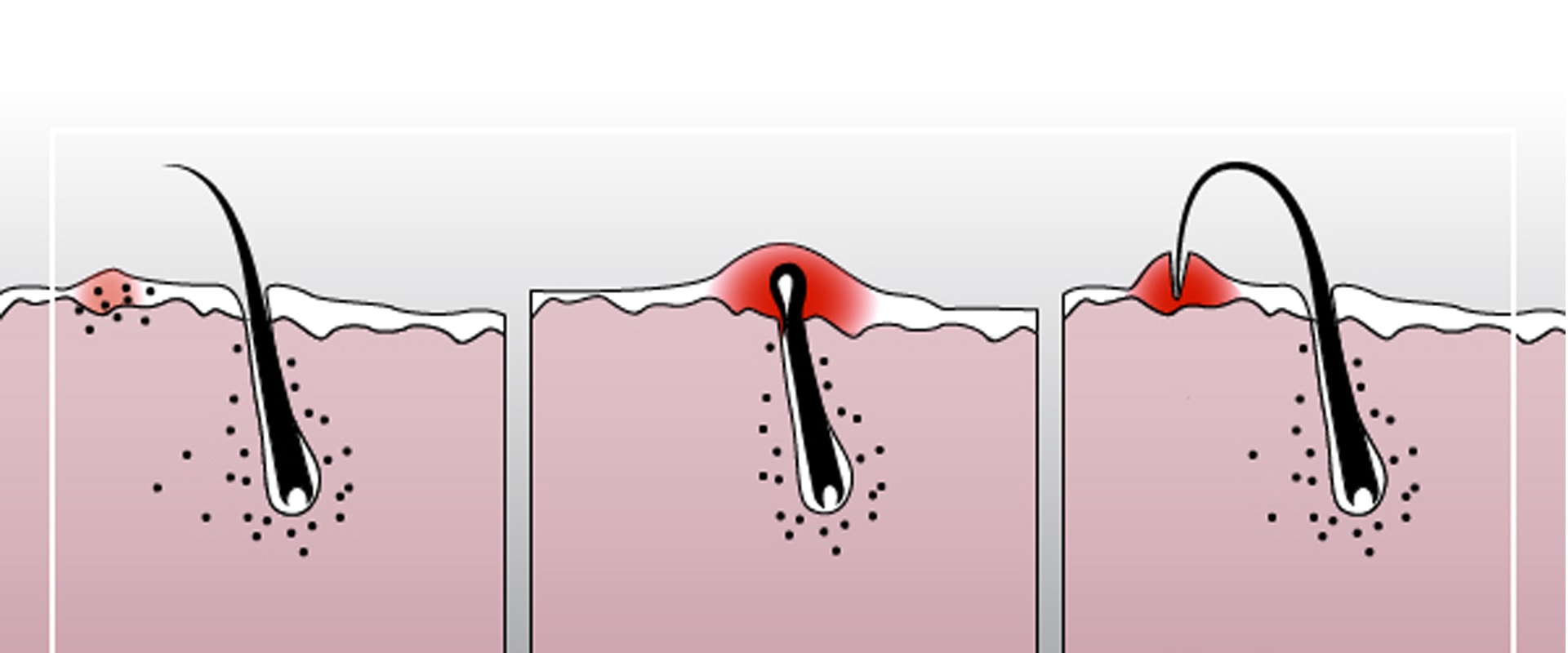 При попытках дальнейшего роста волосинки формируется шишка – проявление псевдофолликулита. Под кожей волосок сгибается или перекручивается и вызывает воспалительный процесс.