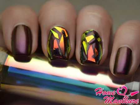 Маникюр с эффектом битого стекла смотрится очень необычно. Эта стильная техника наполнена новизной и экстравагантностью. Она выполняется с помощью голографических целлофановых отрывков, могут применяться кусочки слюды. Материал можно найти в специализированном магазине. Покрытие накладывается на ногти особенным способом, который отражает свет, меняет изломы и создаёт нужный эффект. Создаётся некий калейдоскоп рисунков. В результате получается зеркально ровное полотно с эффектом битого стекла.