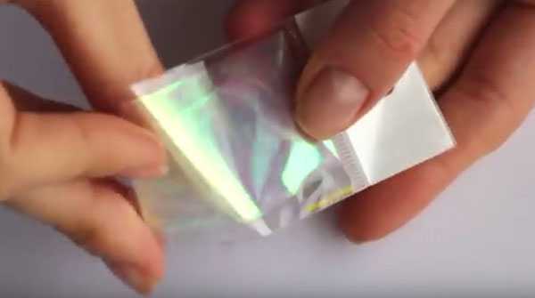 - Возьмите прозрачную голографическую фольгу для литья и отпечатайте ее на липкий слой покрытия.