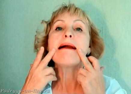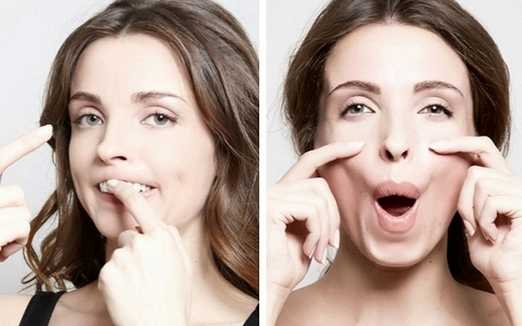Еще одно упражнение: указательные пальцы поставить на щеки напротив губ. Улыбнуться, сопротивляясь пальцами. 3 подхода по 10 счетов.