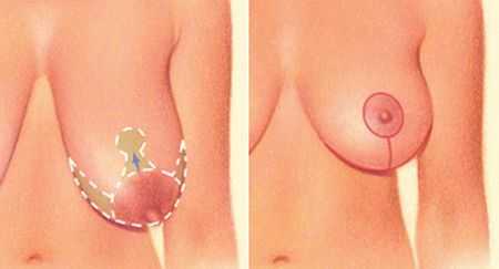 Второй проходит круговой разрез огибает первый на некотором расстоянии. Затем колечко кожи между разрезами удаляется, а кожа, расположенная за вторым разрезом, подшивается к соску.