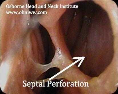 Перфорация носовой перегородки часто протекает бессимптомно, но может привести к целому ряду нежелательных симптомов. Часто отмечаются носовые кровотечения, затруднение дыхания, боль, насморк. Примерно 40% случаев перфорации вызваны хирургией носа.