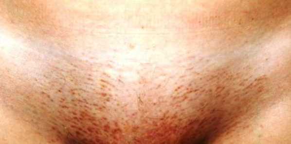 Π£ ΠΆΠ΅Π½ΡΠΈΠ½ Π²ΡΠΎΡΡΠΈΠ΅ Π²ΠΎΠ»ΠΎΡΡ ΠΌΠΎΠ³ΡΡ ΠΏΠΎΡΠ²Π»ΡΡΡΡΡ Π² ΠΎΠ±Π»Π°ΡΡΠΈ Π±ΠΈΠΊΠΈΠ½ΠΈ, ΠΈ ΠΌΠ΅ΡΡΠ°Ρ Ρ Π΅ΡΡΠ΅ΡΡΠ²Π΅Π½Π½ΡΠΌΠΈ ΡΠΊΠ»Π°Π΄ΠΊΠ°ΠΌΠΈ ΠΊΠΎΠΆΠΈ. Π₯ΠΎΡΡ ΡΡΠΎ, ΠΊΠ°ΠΊ ΠΏΡΠ°Π²ΠΈΠ»ΠΎ, Π±Π΅Π·ΠΎΠ±ΠΈΠ΄Π½ΠΎΠ΅ ΡΠΎΡΡΠΎΡΠ½ΠΈΠ΅, ΠΎΠ½ΠΎ ΠΌΠΎΠΆΠ΅Ρ ΡΡΠ°ΡΡ ΡΠ΅ΡΡΠ΅Π·Π½ΠΎΠΉ ΠΏΡΠΎΠ±Π»Π΅ΠΌΠΎΠΉ Π² ΡΠ»ΡΡΠ°Π΅ ΠΏΡΠΈΡΠΎΠ΅Π΄ΠΈΠ½Π΅Π½ΠΈΡ ΠΈΠ½ΡΠ΅ΠΊΡΠΈΠΈ. Π Π·Π°Π²ΠΈΡΠΈΠΌΠΎΡΡΠΈ ΠΎΡ Π΅Π΅ Ρ Π°ΡΠ°ΠΊΡΠ΅ΡΠ° Π² ΡΠ΅Π·ΡΠ»ΡΡΠ°ΡΠ΅ ΠΌΠΎΠΆΠ΅Ρ ΠΏΡΠΎΠΈΠ·ΠΎΠΉΡΠΈ ΠΎΠ±Π΅ΡΡΠ²Π΅ΡΠΈΠ²Π°Π½ΠΈΠ΅, ΡΡΠ±ΡΠ΅Π²Π°Π½ΠΈΠ΅ ΠΈ ΠΏΠΎΠ²ΡΠ΅ΠΆΠ΄Π΅Π½ΠΈΠ΅ ΠΊΠΎΠΆΠΈ.