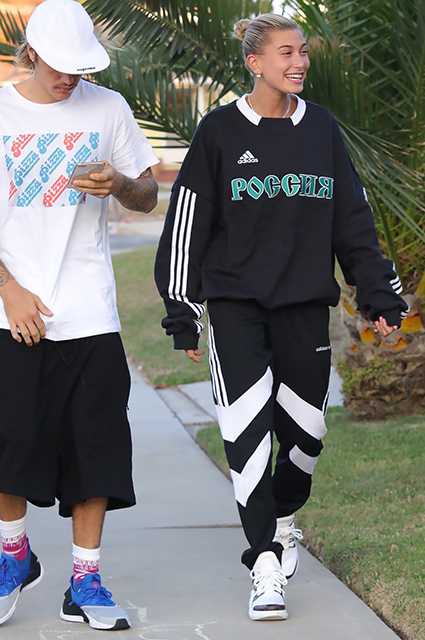 Хейли выбрала толстовку с надписью «Россия» из совместной коллекции российского дизайнера с adidas, которая была представлена в Екатеринбурге в январе этого года, и черно-белые спортивные штаны.